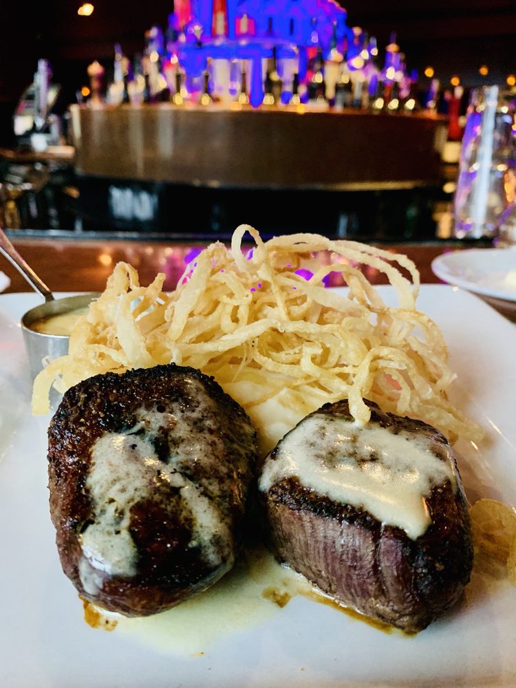 You can’t go wrong with the Steak Griffin, which is a filet topped with garlic, cracked black pepper, roasted shallot Cabernet sauce.